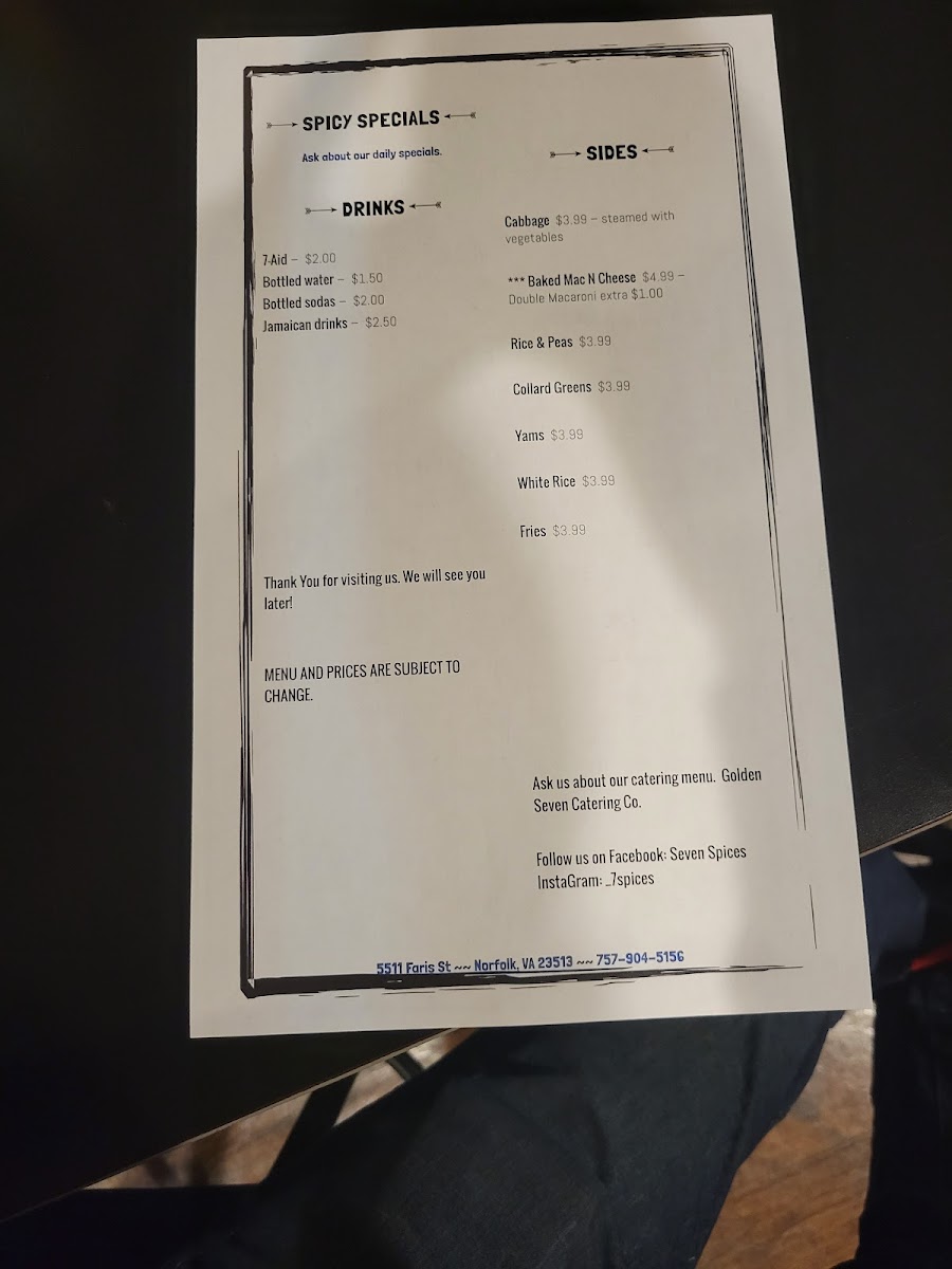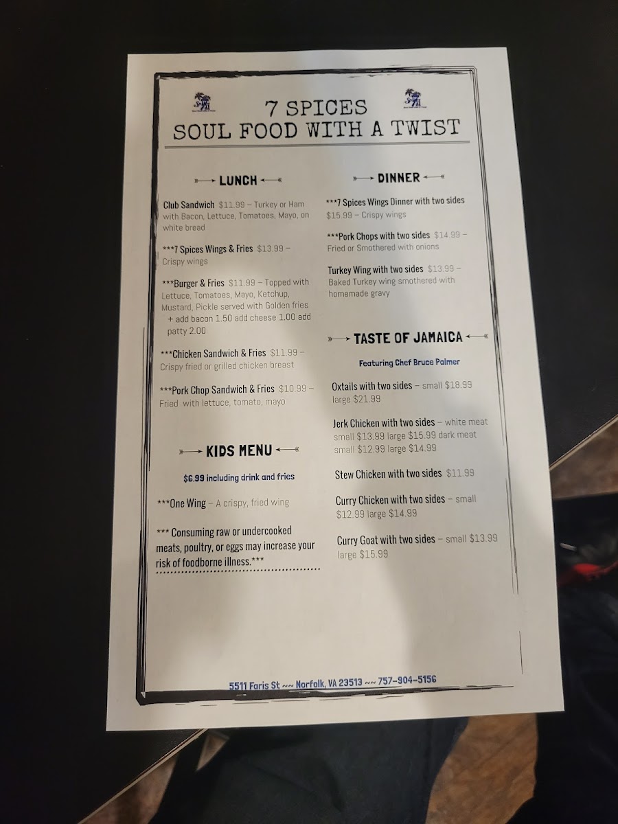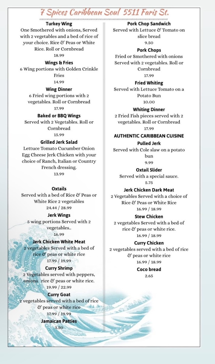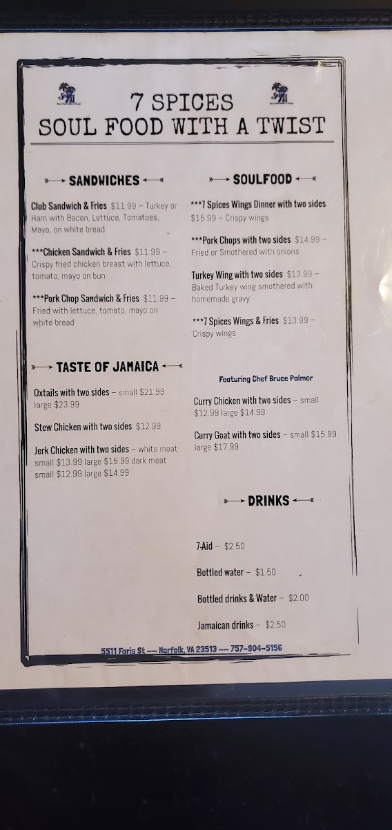 Welcome to 7 Spices Caribbean Soul, a treasure nestled in Norfolk, VA, at 5511 Faris St. This vibrant eatery specializes in authentic Caribbean cuisine, bringing flavors of the islands straight to your plate. The menu features tantalizing dishes that showcase the rich culinary traditions of the Caribbean.
